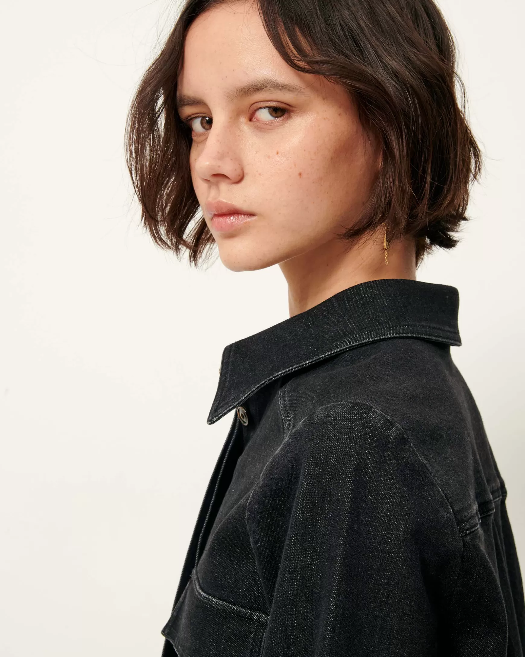 Figurbetontes Hemd mit aufgesetzten Taschen aus gewaschenem Denim, portugiesische Webarbeit.