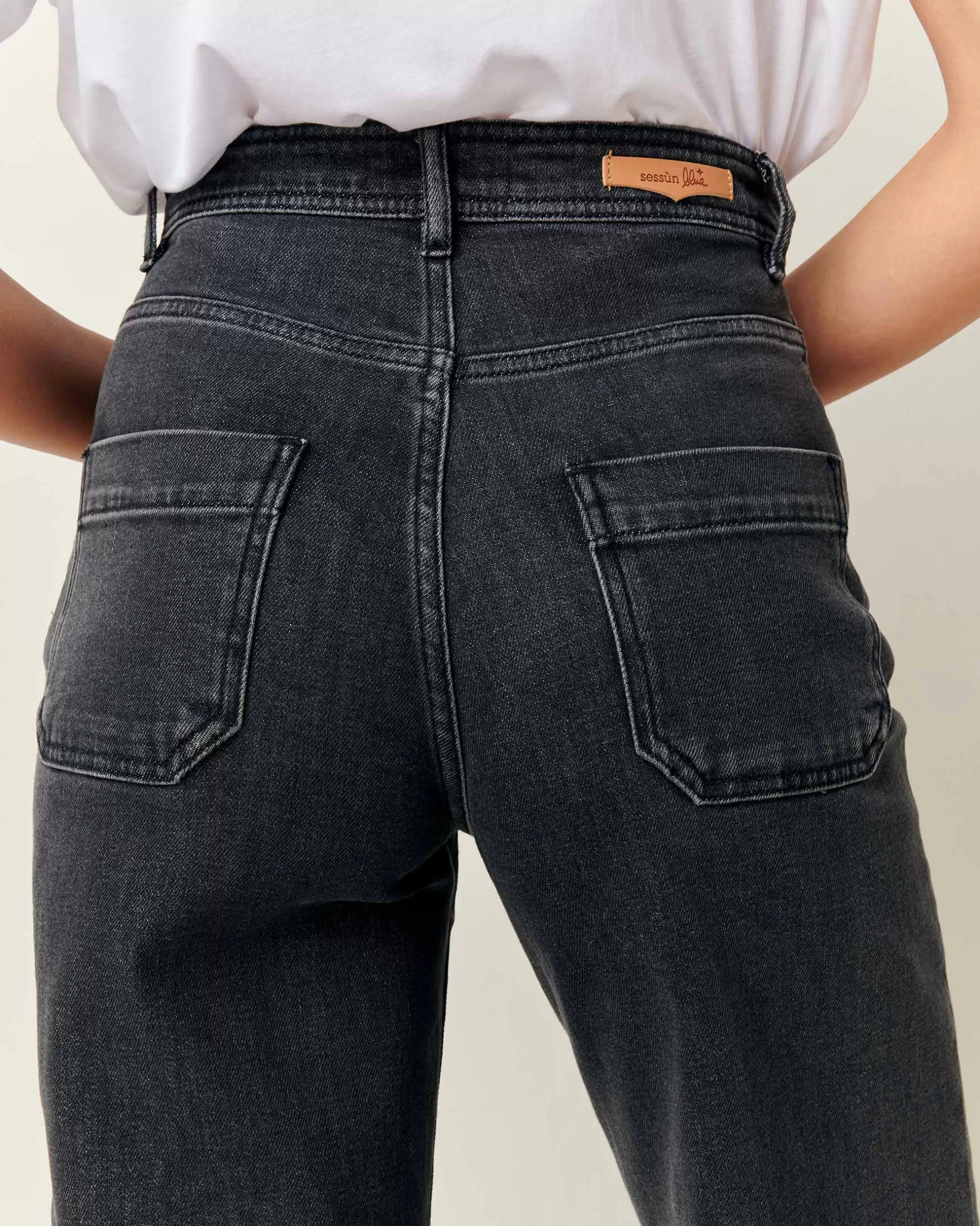 Vordertaschen, Tickettasche und aufgesetzte Gesäßtaschen mit doppelter Steppnaht.