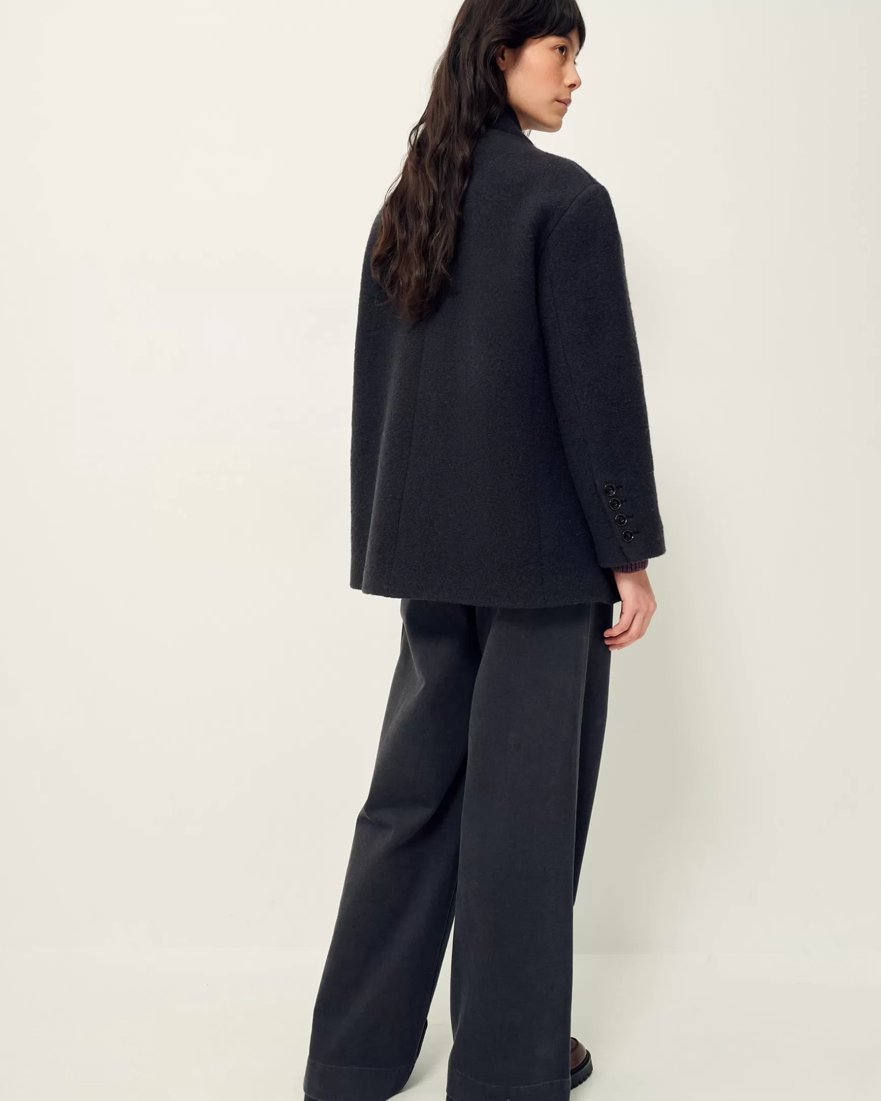 Gerade geschnittene Jacke im Stil einer Schneiderjacke mit hochgestelltem Kragen aus schwerem Lodengewebe (gekochte Wolle) in Leinwandbindung, italienische Webarbeit.