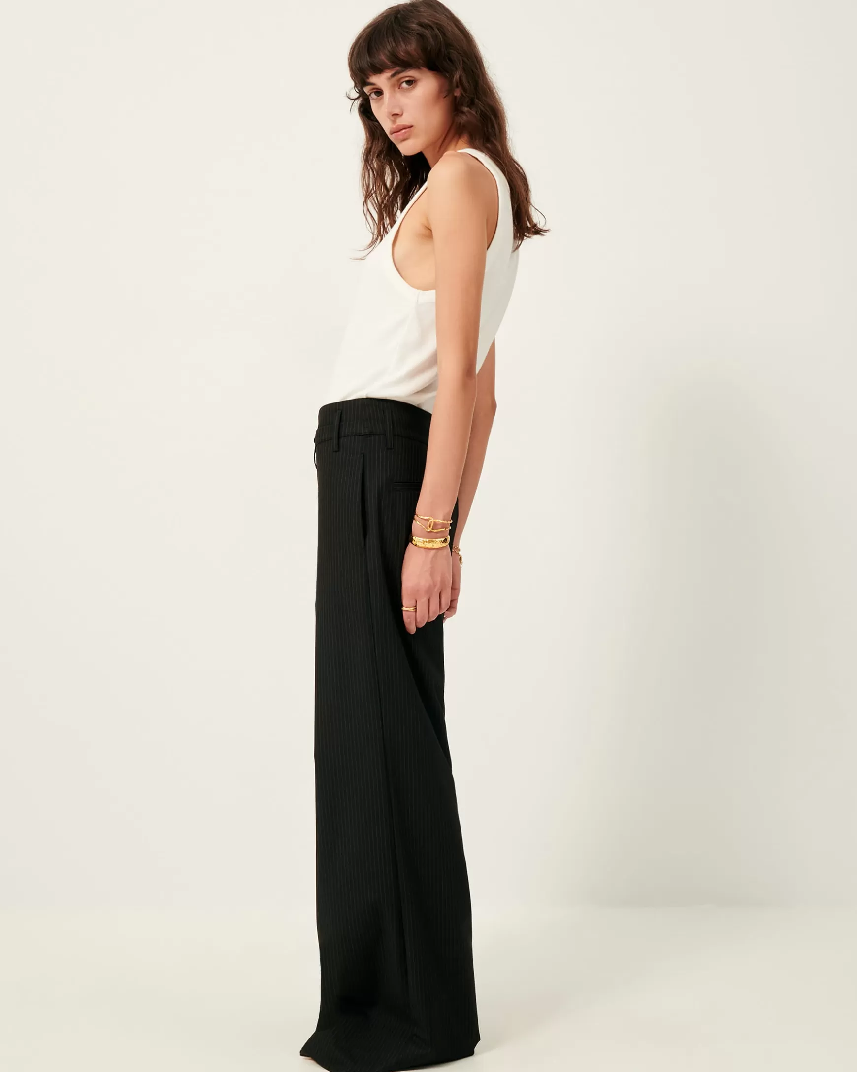 Locker geschnittene Hose aus kompaktem Popeline in Jacquardbindung mit zarten kontrastierenden Streifen, weitenverstellbarer Tuchgürtel aus demselben Material, italienische Webarbeit, exklusiv für Sessùn angefertigt.